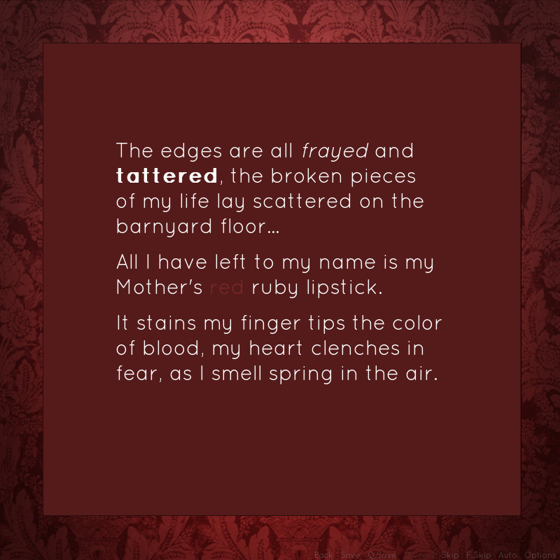 How many memories can be distilled into a single phrase, a simple scent, a haunting melody. . .? A short kinetic novel about a young woman named Gloria Nightingale, within four short segments centering around a moment in time that changed her life. itch.io]