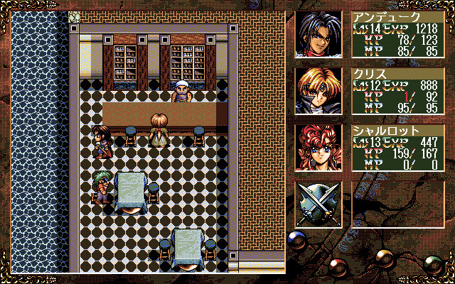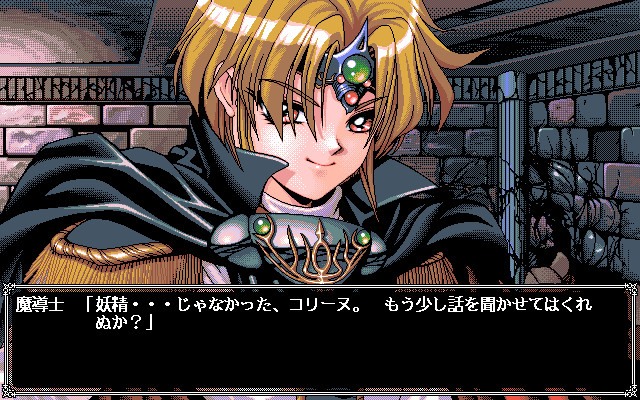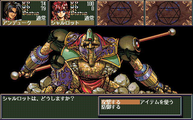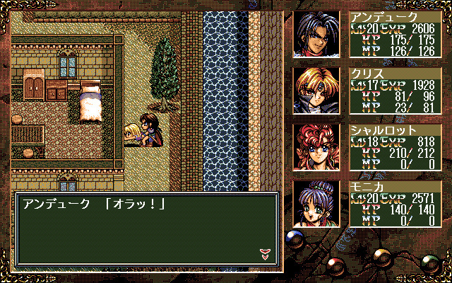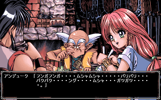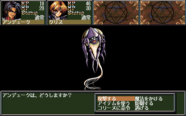 Dangel is a traditional Japanese-style RPG. Anduke meets companions on his quest, who join his party. The navigation is done from top-down perspective, while random turn-based battles use first-person view. Player-controlled characters can use regular attacks or magic. Anduke is also able to give commands to his elf companion, who has access to many magical spells. The game features full-screen anime-style cut-scenes to advance the story, many of which depict sexual encounters.
