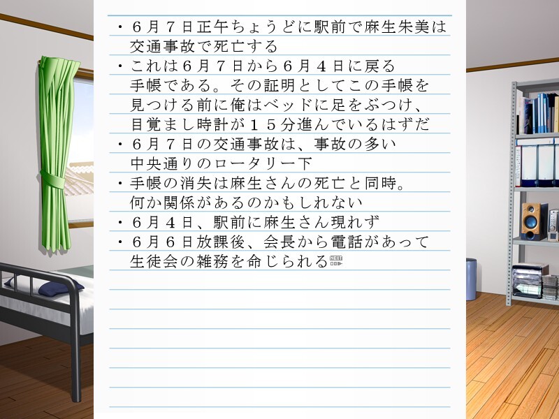 It's a story of 4 days of struggle where Okiomi tries to prevent the car accident that kills Akemi. Use a mysterious notebook to save her in this adventure game (with fairly high difficulty).