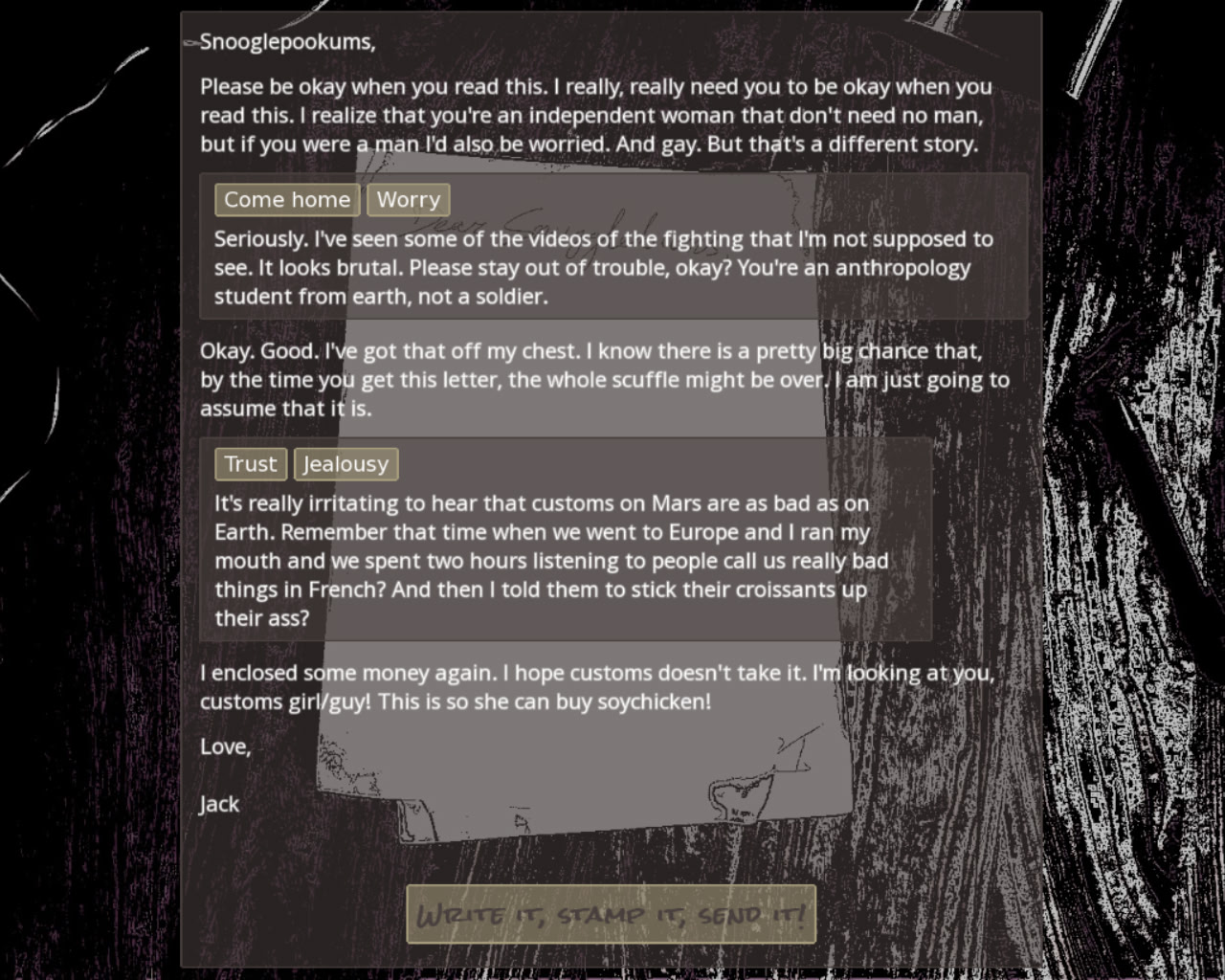 Mars is, at best, 13 minutes of light removed from Earth. So when your girlfriend gets on the Commercial Virgin spaceflight to teach at Mars University, you realize the relationship has... a bit of a challenge. Will your penmanship be enough to keep the relationship warm? Ludum Dare] Created for ...