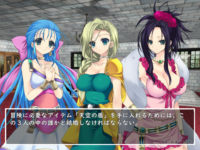 In order to continue on his quest, however, the hero was in search for the "Heavenly Shield". To be able to bring this item into his possession, he has to engage in this bridal game and marry one of them!