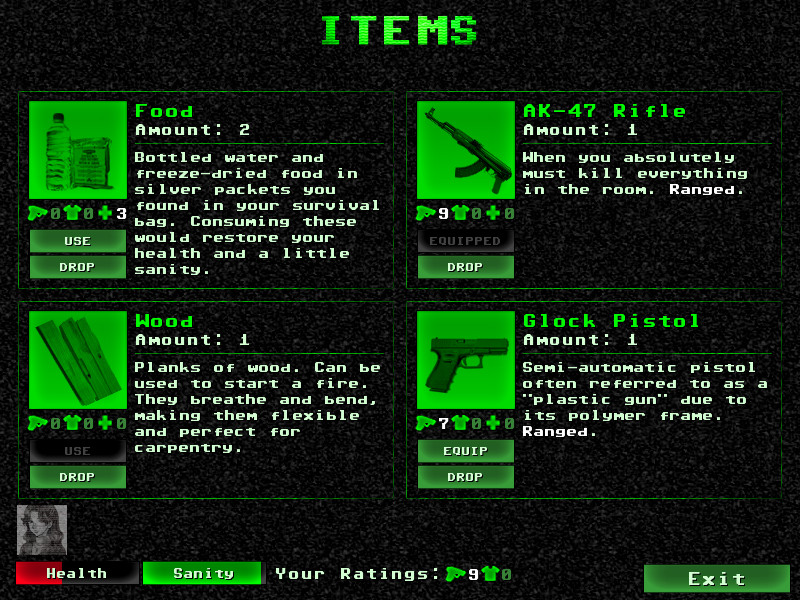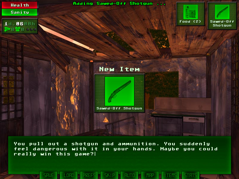 You will start the game with some food rations and a random weapon. You can get anything from a shoe to a flame thrower.