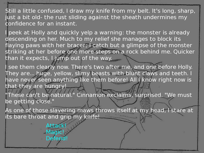 You take up the role of Lynx, a neko (catgirl) storyteller who joins an adventuring dynamic duo, Holly and Cinnamon, in their quest to make away with the treasures of the Lataran Temple. But just as they near their goal, things start taking an ominous turn as she begins to question her teammates' intentions.