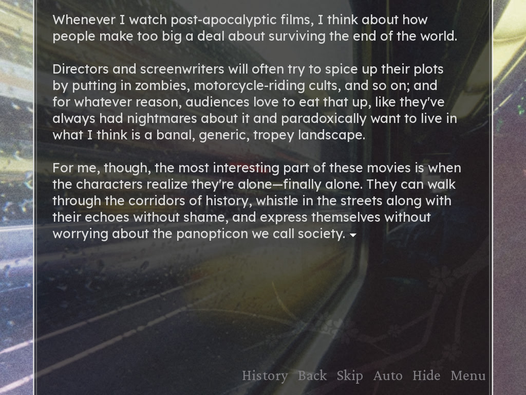 "I dream of myself, taking Nica by the hand and leading her through the rainy streets of a desolate London. I see these roads broken and littered with cars, Kensington Park overgrown with weeds, Big Ben's clock tower fallen by the wayside— Maybe others would think of this as eerie, but to me, this ...