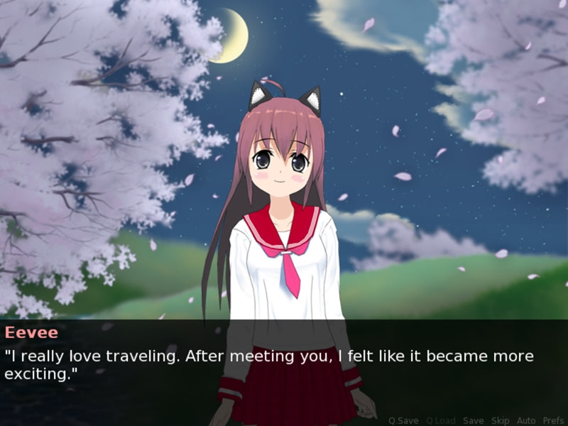 The main character awakens in the evening out on the vast grassy plain without any memory of the self meeting Eevee and Kyoko traveling around. They insist the main character joins them on their travels, which may cause a remembrance of the past meant to be forgotten.