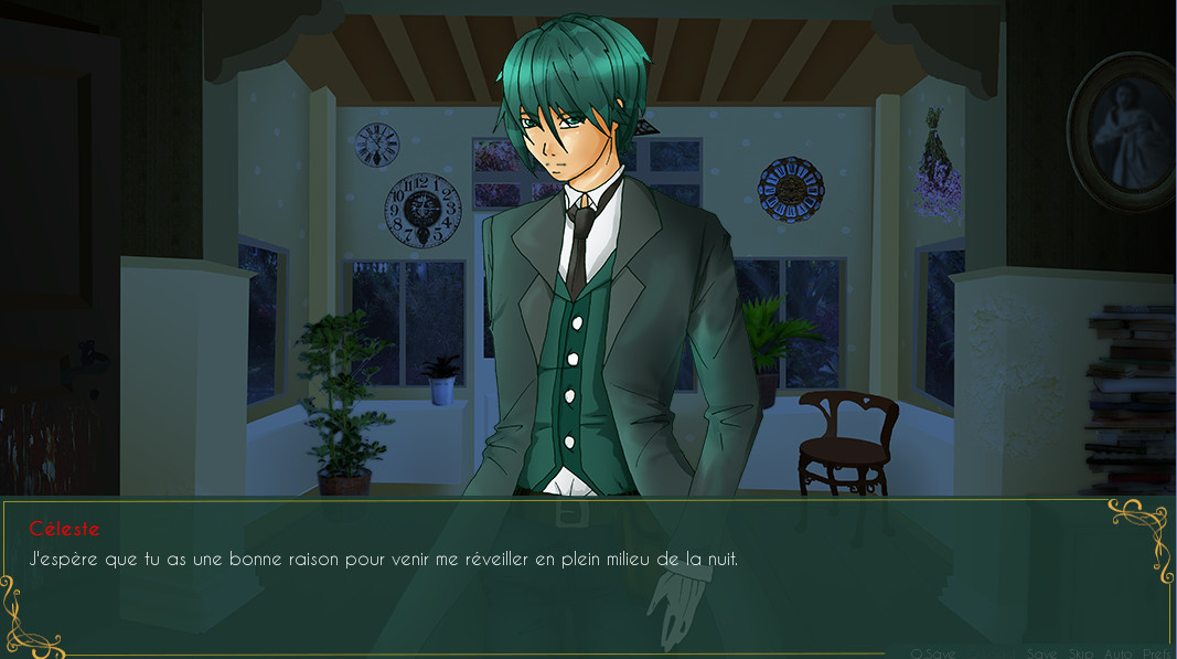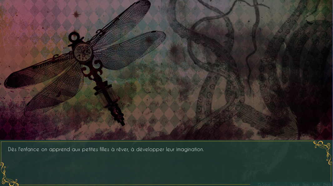 La Libellule Mécanique is a steam-punk otome game. Céleste, the protagonist, is searching for her father, the inventor of the Libellule Mécanique. He was taken in the city of Koréare, an underground city populated by people banished from the upper city, by an organisation that wants to use the Libellule Mécanique to conquer the upper world.