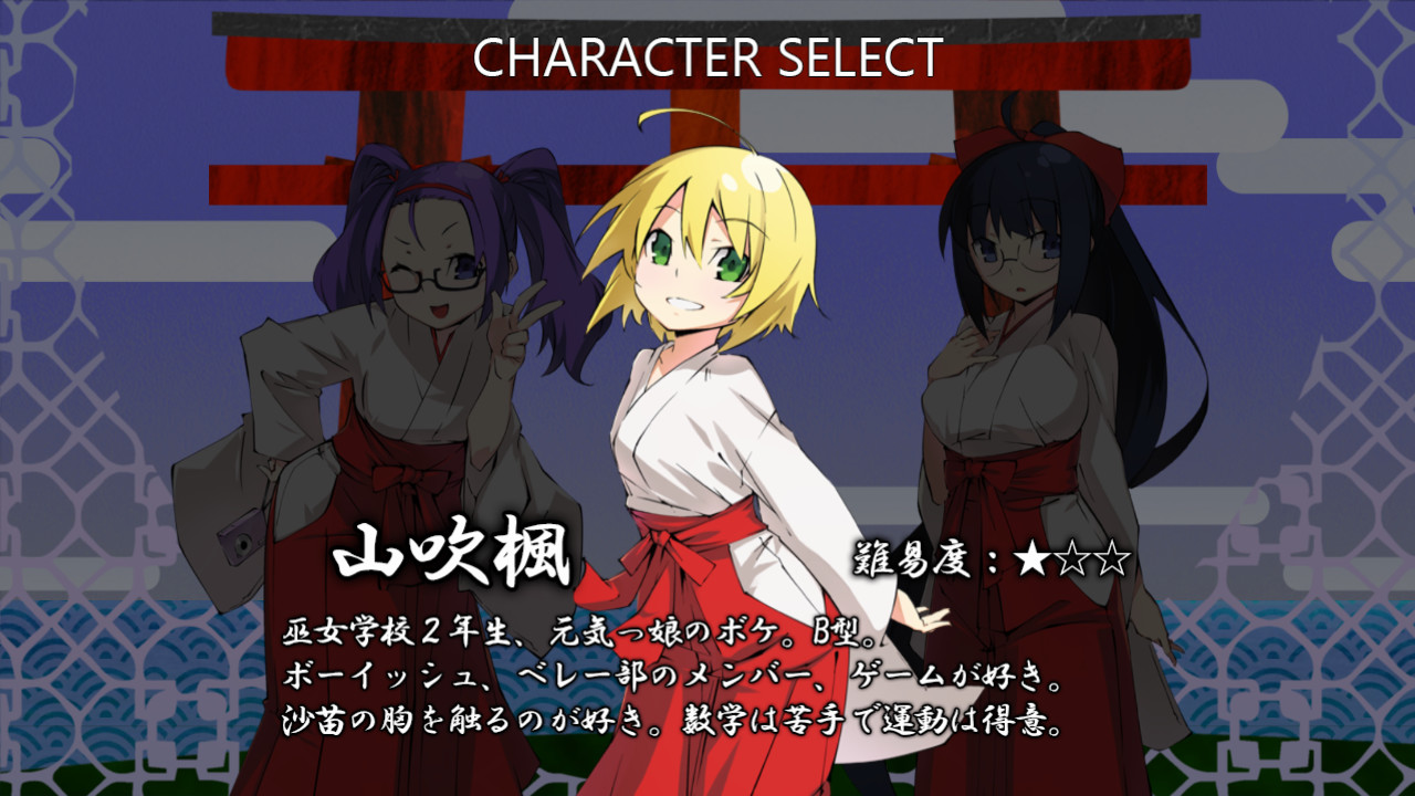 Summer's here! Not wanting to be cooped up in their dorms all summer doing homework, sophomore shrine maidens Kaede, Sanae, and Yuu, go outside to enjoy themselves and create some everlasting memories. However, those troublesome youkai are at it again, interfering with the summer festivities happening all over town. From the shining beaches to the brilliant fireworks display, it's up to our three heroines to prevent the youkai from ruining summer for everyone, all the while trying to enjoy themselves and put off homework a little bit longer in this action rhythm game.