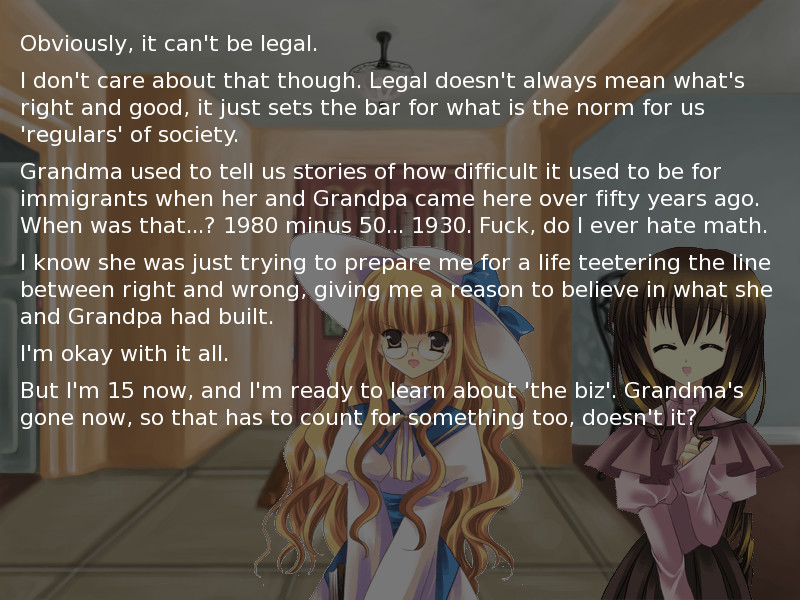 Mafiosi: Le Loro Cosa is a kinetic novel about a mafia family known as the Gallos. The story is told through the eyes of the Gallo children, who range from the ages of 6-15, as they become involved in the shady dealings of the family business. The story begins with the sudden death of the family m...